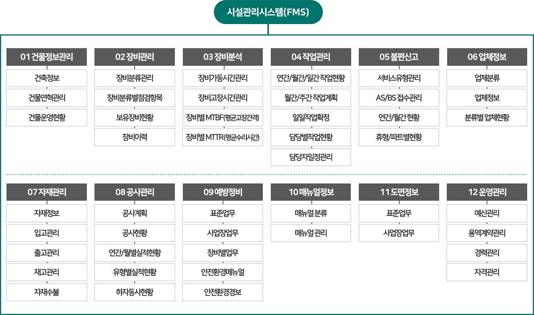 FMS시스템은 각종 시설장비에 대한 유지보수 활동을 효과적으로 지원하는 시스템으로 정보화, 자동화에 대응한 건물 내의 제반 시설물에 대한 이해를 돕고, 유지관리를 위한 환경에 도움을 주는 시스템입니다