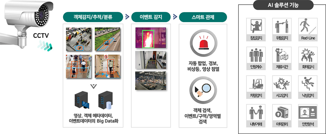 보안 CCTV의 실시간 영상 분석, 움직임 및 이벤트를 감지하여 녹화, 재생, 검색까지 할 수 있는 All-in-One 지능형 영상 감시 시스템을 구축하는 AI 영상 분석 솔루션입니다